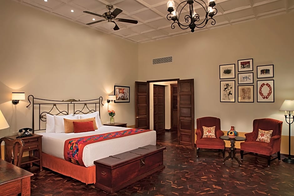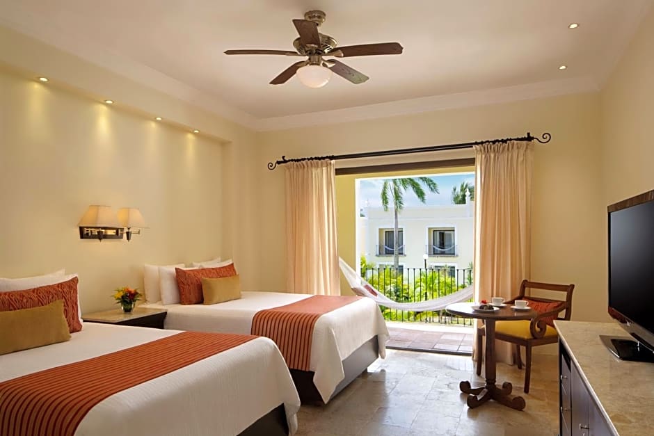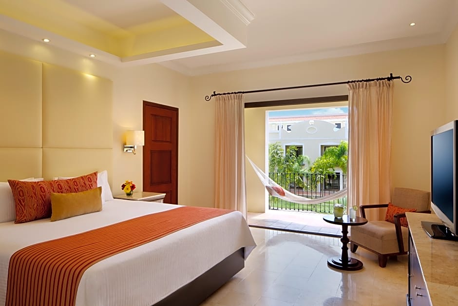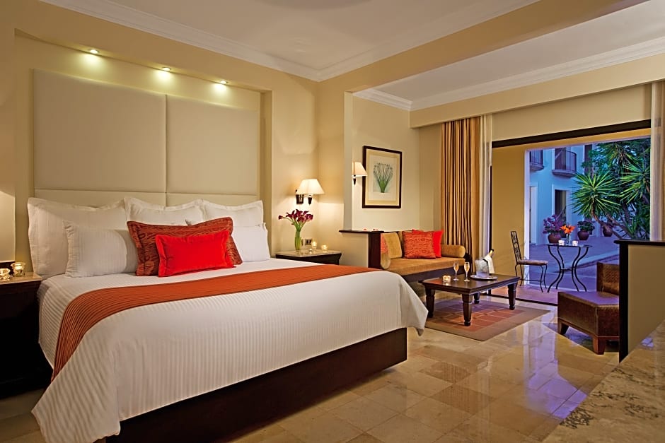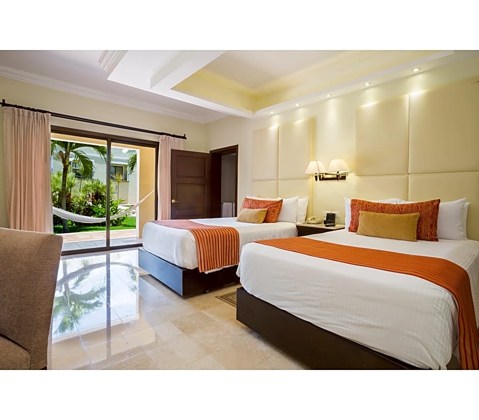This room in the adults-only section features contemporary decor, king or two double beds, bathroom, double sink, private terrace and a beautiful direct swim-out access to a refreshing swimming pool that flows to each private patio. Built in the shape of old haciendas centering the garden and plaza with a fountain and benches creating a sense of old México. Bar service by the pools.